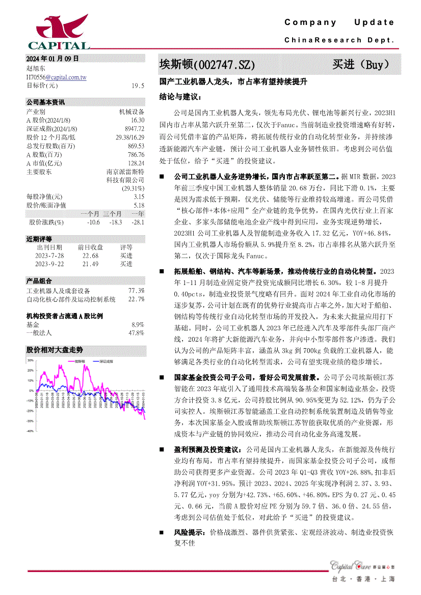 C o m p a n y U p d a t e C h i n a R e s e a r c h D e p t 。 阿2024年01月09日赵旭东方针价(元) 19。5 公司根基资讯财产别机械设备A股价(2024/1/8) 16。30 深证成指(2024/1/8) 8947。72 股价12个月高/低29。38/16。29 总刊行股数(百万) 869。53 A股数(百万) 786。76 A市值(亿元) 128。24 次要股东南京派雷斯特科技无限公司(29。31%) 每股净值(元) 3。15 股价/账面净值5。18 一个月三个月一年股价涨跌(%) -10。6 -18。3 -28。1 近期评等出刊日期2023-7-28 2023-9-22 前日收盘22。68 21。49 评等买进买进产物组合工业机械人及成套设备77。3% 从动化焦点部件及活动节制系统22。7% 机构投资者占畅通A股比例基金8。9% 一般法人47。8% 股价相对大盘走势埃斯顿(002747。SZ)买进(Buy) 国产工业机械人龙头,市占率无望持续提拔结论取:公司是国内工业机械人龙头,领先结构光伏、锂电池等新兴行业,2023H1国内市占率从第六跃升至第二,仅次于Fanuc。当前制制业投资增速略有好转,而公司凭仗丰硕的产物矩阵,将拓展保守行业的从动化转型营业,并持续渗入新能源汽车财产链,估计公司工业机械人营业韧性照旧。据MIR数据,2023年前三季度中国工业机械人全体销量20。68万台,同比下滑0。1%,次要是由于需求低于预期,仅光伏、储能等行业维持较高增速。而公司凭仗“焦点部件+本体+使用”全财产链的合作劣势,正在国内光伏行业上百家企业、多家头部储能电池企业产线中获得使用,营业实现逆势增加,2023H1公司工业机械人及智能制制营业收入17。32亿元,YOY+46。84%,国内工业机械人市场份额从5。9%提拔至8。2%,市占率排名从第六跃升至第二,2023年1-11月制制业固定资产投资完成额同比增加6。30%,较1-8月提拔0。40pcts,制制业投资景气宇略有回升。面临2024年工业从动化市场的逐渐苏醒,公司打算正在既有的劣势行业提高市占率之外,加大对于船舶、钢布局等保守行业从动化转型市场的开辟投入,为将来多量量使用打下根本。同时,公司工业机械人2023年曾经进入汽车及零部件头部厂商产线年将扩大新能源汽车营业,并向中小型零部件客户渗入。我们认为公司的产物矩阵丰硕,涵盖从3kg到700kg负载的工业机械人,可以或许满脚各类行业的从动化转型需求,公司无望实现业绩的稳步增加。公司子公司埃斯顿江苏智能正在2023岁尾引入了通用手艺高端配备基金和国度制制业基金,投资方合计投资3。8亿元,仍为子公司实控人。埃斯顿江苏智能涵盖工业从动节制系统安拆制制及发卖等营业,本次国度基金入股或帮帮埃斯顿江苏智能获取优良的财产资本,构成本钱取财产链的协同效应,盈利预测及投资:公司是国内工业机械人龙头,正在新能源及保守行业均有结构,市占率无望持续提拔,而国度基金投资公司子公司,或帮帮公司获得更多财产资本。群益证券()无限公司。不合错误此演讲之精确性及完整性做任何,或代表或做出任何书面,并且不会对此演讲之精确性及完整性负任何义务或权利。群益证券()无限公司,及其分公司及其联营公司大概正在收到此份演讲前利用或按照此份演讲之材料或研究保举做出任何步履。群益证券()无限公司及其任何之一位董事或其代表或雇员不会对利用此份演讲后招致之任何丧失负任何义务。群益证券()无限公司及其任何之一位董事或其代表或雇员或会对此份演讲内描述之证持看法或立场,或会买入,沽出或供给发卖或出价此份演讲内描述之证券。群益证券()无限公司及其分公司及其联营公司可能以其户口,或代他人之户口买卖此份演讲内描述之证。